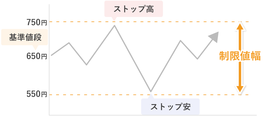 値幅制限は基準値段によって定められており、値幅制限いっぱいまで株価が進むと、それ以上の株価変動はしなくなります。上限いっぱいまでいくことは「ストップ高」、下限いっぱいまでいくことは「ストップ安」と呼ばれます。例えば基準値段が650円の株式の場合、値幅制限は上下100円なので、550円になったらストップ安、750円になったらストップ高です。